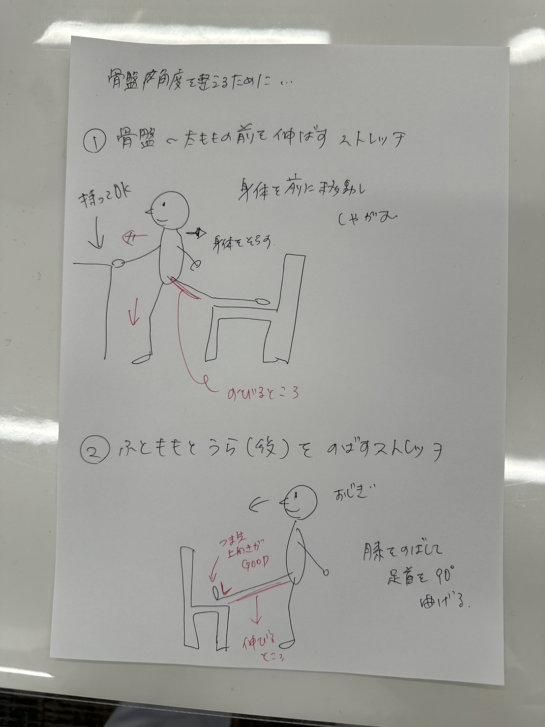 骨盤に着く前と後ろの筋肉を1日1回1分伸ばす!椅子を使うと簡単な実施できます。