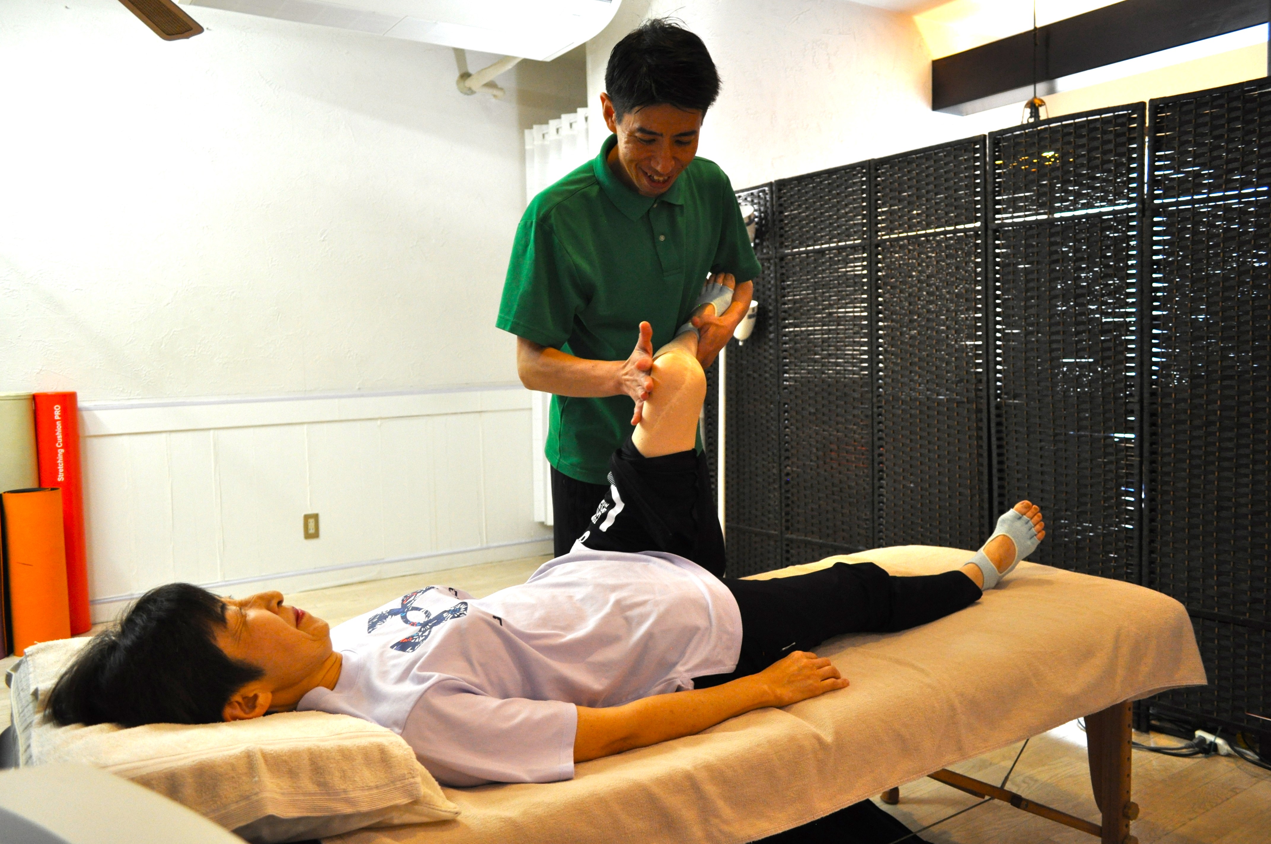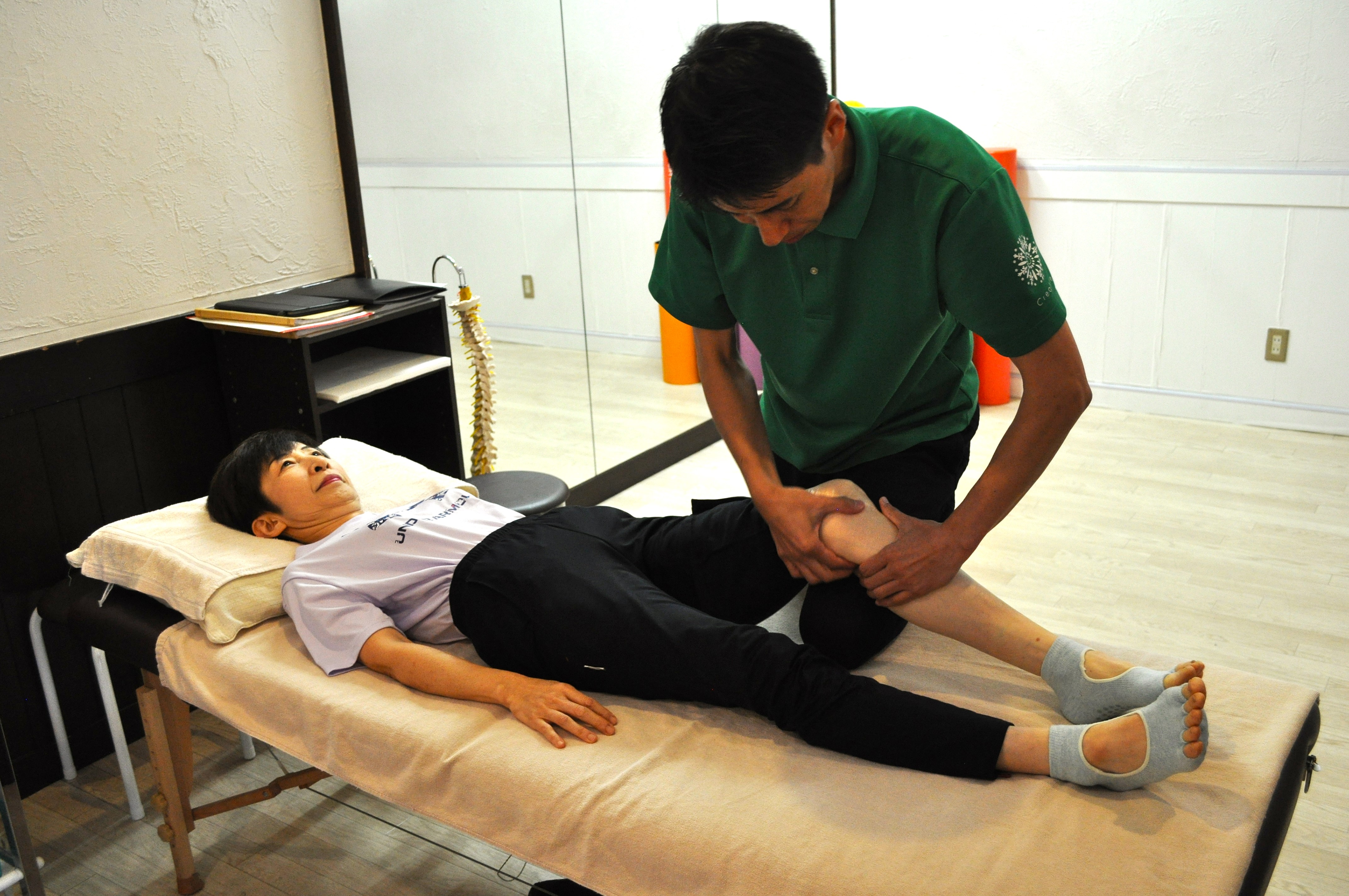 初回の施術では、膝周りの筋肉の緊張をほぐす手技を行った後、