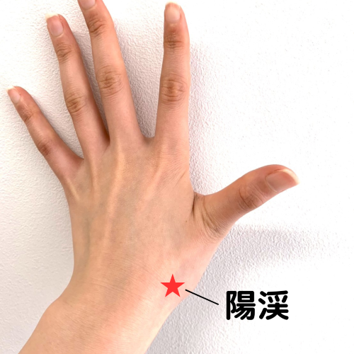 手の甲が上になった状態で親指を外に開いたときに、手首の親指側にある腱と骨の間のくぼみにあるツボです。手首を反らせるとくぼみができるので、そのくぼみに位置します。反対の手の親指で3~5秒を目安に、気持ちいいと感じる程度の強さで押して、ゆっくりと離すのを数回繰り返してみましょう。