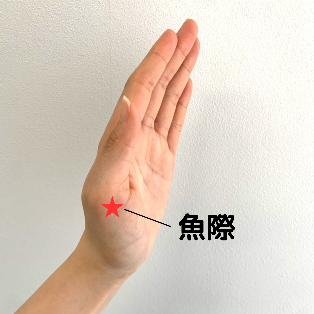 手のひらと手の甲の境目にあるツボで、親指の付け根にあるふくらみの中央あたり、親指の骨の際に位置します。手のひらを横にむけてよく見ると、手のひら側は赤みがあり、手の甲側は白っぽくなっています。その境目をたどっていくと、少しへこみがあり、くぼみにあります。親指の付け根にしびれを感じた時に、反対の手の親指で3~5秒ほど目安に、魚際を優しく押してみましょう。強く押して刺激が強くなりすぎないように注意しましょう。